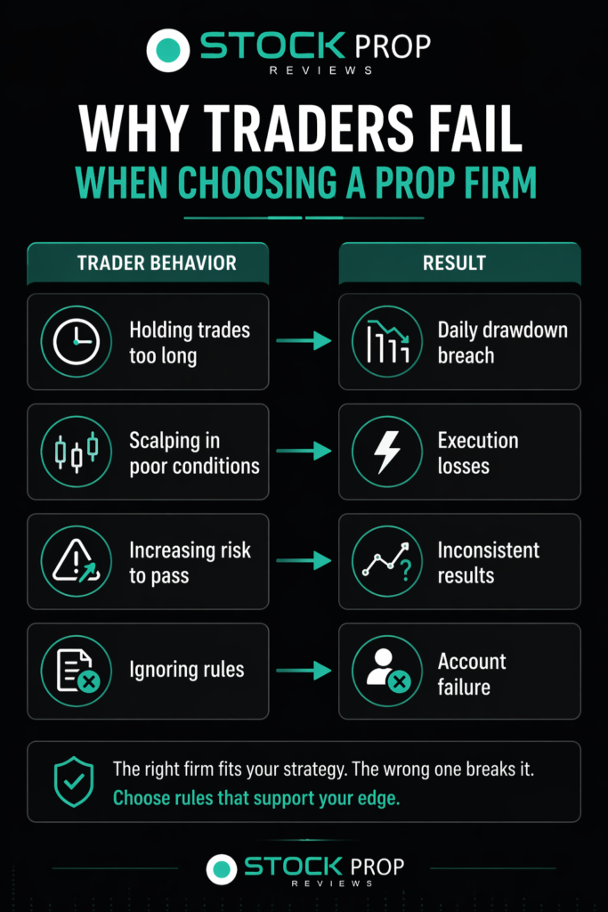A trader who usually holds trades for two to three days signs up with a firm that has a tight daily drawdown and a trailing equity model. The trade goes slightly negative before moving in the expected direction. The account is breached before the setup plays out.
