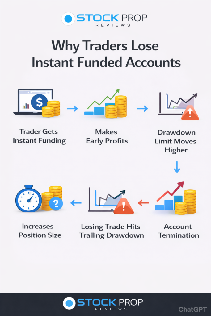 When traders pay a fee, instant funding prop firms give them a funded account right away. Traders who want quick access to money like them because they don’t have to go through an evaluation phase. But instant funding prop firms also have stricter risk models, especially trailing drawdown, which makes it harder for traders to stay in business for a long time than they think.