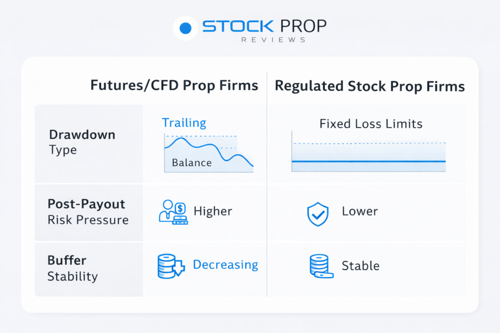 Many futures and CFD companies use trailing drawdowns that keep going even after you take out your profits. Regulated stock prop firms are more likely to use fixed loss limits, which can make things less stressful after payouts.