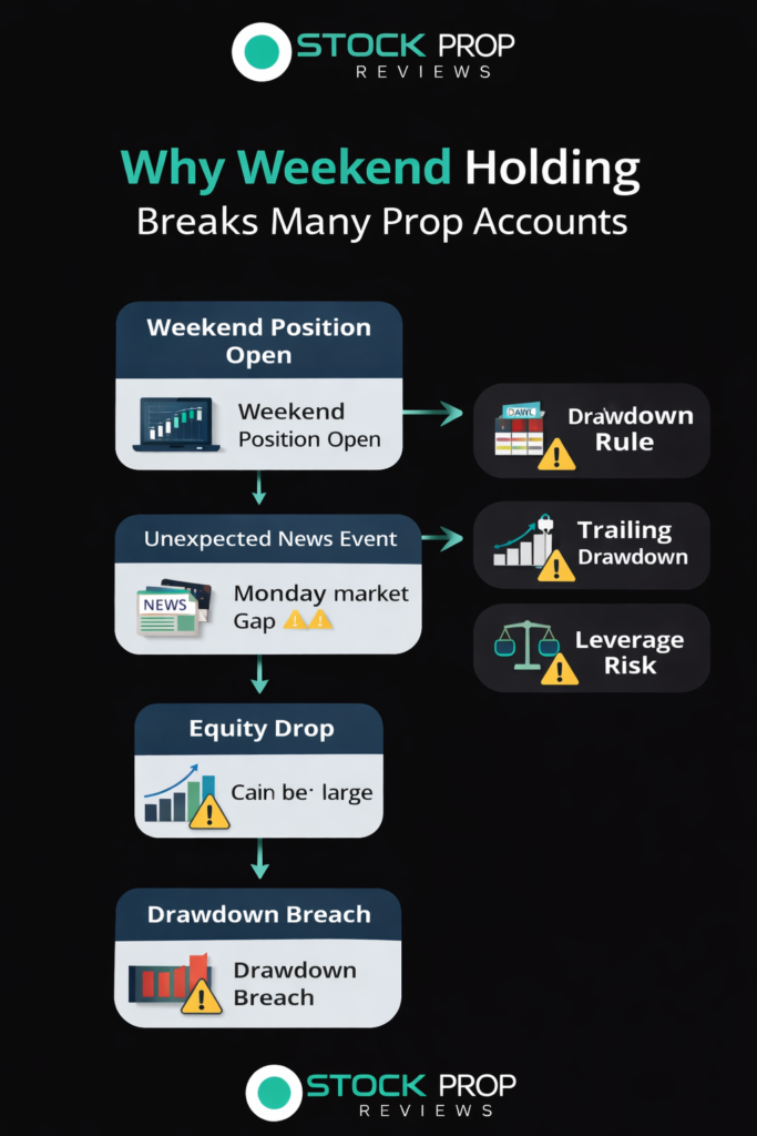 The second factor is daily loss limits. A weekend gap can trigger a daily drawdown breach instantly even if the trader did not place any new trades.