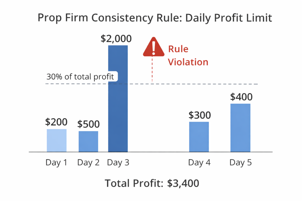 Most traders don’t break the consistency rule by betting. They fail because profits tend to group together.